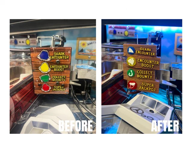 Enhance your Stern Jaws pinball machine with the Mezel Mods Wooden Sign playfield upgrade. This detailed mod features a themed wooden-style sign that adds depth, realism, and movie-inspired aesthetics to the playfield. Designed for precise fitment and easy installation with no permanent modifications required, it’s an excellent upgrade for collectors looking to elevate the visual presentation of their Jaws machine.