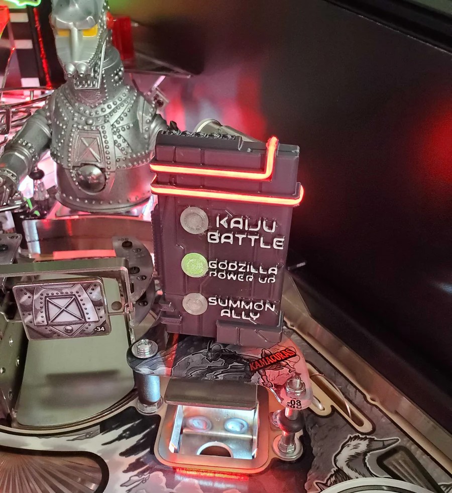 Enhance your Stern Godzilla 70th Anniversary pinball machine with the Mezel Mods Kaiju Scoop Sign. This detailed custom playfield mod upgrades the factory scoop area with themed Kaiju signage, adding depth, colour, and cinematic flair to the cityscape. Precision-crafted for exact fitment and easy installation with no permanent modifications required, it’s an ideal visual upgrade for collectors and operators seeking enhanced playfield immersion.