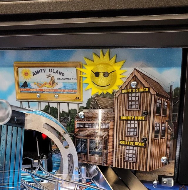 Upgrade the look of your Stern Jaws pinball machine with the Mezel Mods Sun Flasher Replacement. This custom lighting mod replaces the factory flasher cover with a detailed sun-themed piece that enhances illumination and adds cinematic beach atmosphere to the playfield. Precision-crafted for proper fitment and easy installation with no permanent modifications required.
